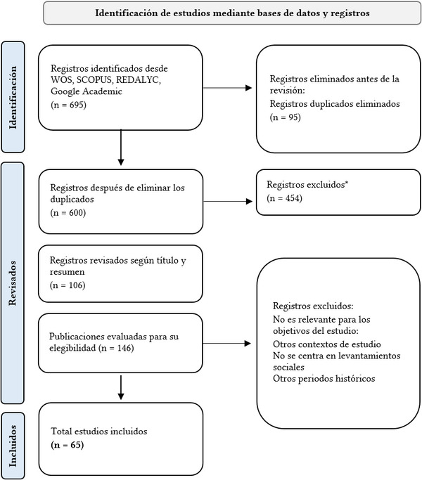 Se construyó una base de datos con los 600 artículos restantes, revisando sus títulos y resumen, excluyendo 454 artículos que no cumplían con los criterios de inclusión. El corpus para revisión completa quedó conformado por 146 artículos. Luego se excluyeron aquellos textos cuyo contenido escapa a los objetivos de la investigación en la que se enmarca la revisión. Los criterios para descartar artículos fueron: a). Referirse a procesos de levantamiento social, revuelta o protestas en otros países, o momentos históricos distintos del segundo semestre 2019 y no plantean una relación con el caso chileno estudiado. b). Abordar procesos de organización no vinculados con el levantamiento social del 2019. c). Referirse a movilizaciones, protestas y acciones colectivas en Chile en otros momentos históricos, tales como las estudiantiles de 2011, territoriales en el sur del país, feminista de 2018, etc. En la figura 1 se presenta el diagrama de flujo del proceso.